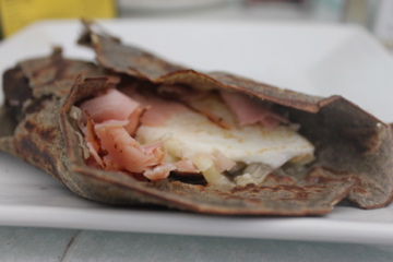 After flipping your galette once, crack an egg in the center and let it begin to cook. Slice or tear the ham into small pieces and intersperse with generous amounts of grated gruyere. When the egg is just about cooked, fold the galette around the contents and serve.